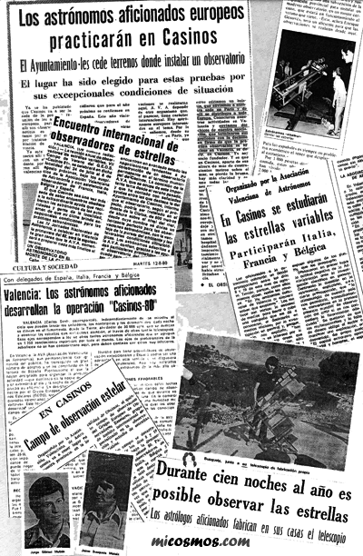 Podría contar algunas anécdotas más como, por ejemplo, la discusión acalorada en un bar de la población entre Enrique Genovés y alguna paisana de Casinos sobre si el Hombre pisó o no la Luna. O la que protagonicé cuando, en mitad de una de las noches de observación, sobre la una de la madrugada, un vehículo se nos acercaba con sus faros a máxima potencia y salí a cortarle el paso, al tiempo que lanzaba todo tipo de improperios y maldiciones a gritos. En eso bajó del vehículo un individuo que se identificó como escolta del presidente de la Diputación de Valencia, Manuel Girona, que había oído hablar de lo que estábamos haciendo y venía a visitarnos.