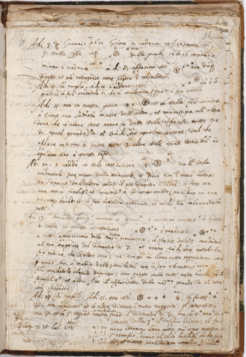 Página manuscrita del Sidereus Nuncius en la que relata las observaciones de los satélites de Júpiter entre el 7 y el 14 de enero de 1610. Los primero días, sólo fueron visibles 3 satélites. Tuvo que esperar hasta el 13 de enero para divisar 4 satélites.