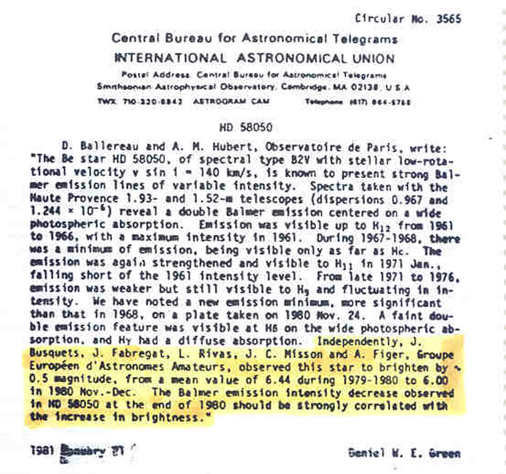 Tras la oportuna comunicación a los profesionales. A.M. Hubert del observatorio de Meudon (Francia) comunica que en un espectro de HD 58050 tomado a finales de noviembre de 1980, se apreciaba una neta disminución en la emisión de la estrella. Este fenómeno, ligado sin duda al aumento de brillo observado por nuestro grupo (GEOS) de forma independiente, hizo que se disiparan todas las dudas. El hecho fue comunicado por la IAU en su Circular 3565. Posteriormente, HD 58050 recibió su denominación definitiva como OT Gem y fue incluida en el General Catalogue of Variable Stars, como variable de tipo Gamma Cas (GCAS).
