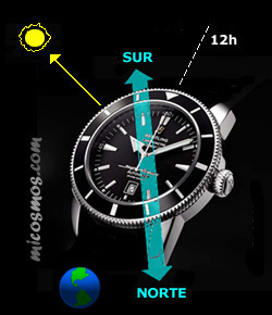 Antes que nada tendremos que poner en el reloj la hora solar, que difiere de la hora civil en una hora en invierno y dos en verano, cantidad que deberemos restar a lo que marca el reloj.